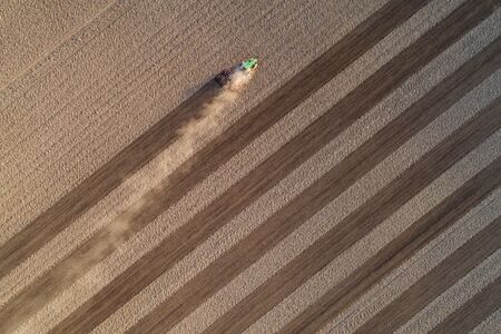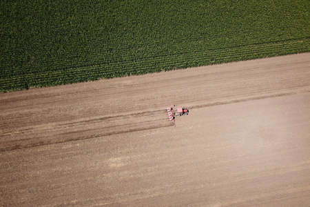 agricultural technology, Planting corn on the field in agricultural rural Thailand with tractor, High angle view;