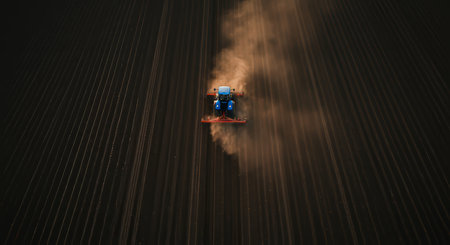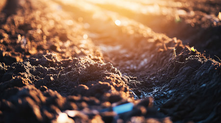 This image captures the intricate details of freshly plowed soil, showcasing the dirt particles illuminated by sunlight, reflecting the essence of agriculture.