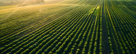 A stunning view of green crop fields at sunrise, showcasing neatly arranged rows and a warm golden glow illuminating the rural landscape.