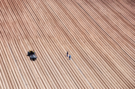 Furrows rows pattern in a plowed field prepared for planting potatoes crops in spring.