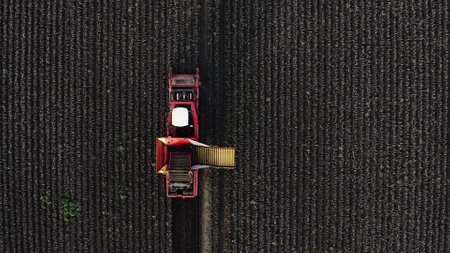 Farmers harvesting vegetables or fruits in a farmer's field in early autumn in sunny day. Generated AI. Top view.