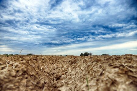 Ploughed field in sunset light. Agricultural landscape. Close up