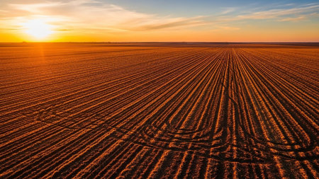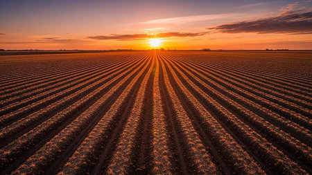 A dramatic sunset casts long shadows over a vast agricultural field with precisely aligned rows of tilled earth.