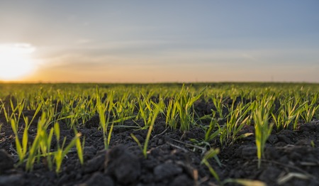 Agriculture banner. Sprouts in the spring field. Sprouting seeds from a low angle view. Germination concept
