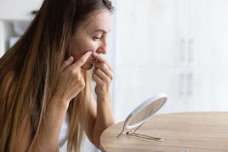 Young woman looking and squeeze acne on a face in front of the mirror. Ugly problem skin girl, teen girl having pimples. Skin care. Beauty