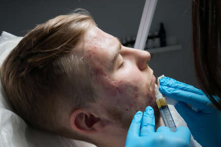 Injection at spa salon. Doctor hands in gloves. Closeup. Pretty male patient. Beauty treatment. Healthy skin procedure. Young man face. Plasmolifting rejuvenation.