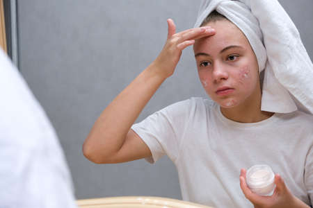 acne. A teenage girl applying acne medication on her face in front of a mirror. Care for problem skin
