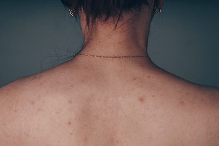 woman back with acne, red spots, skin disease