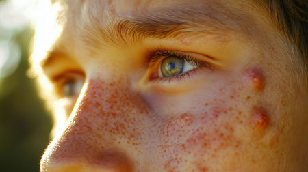 Close-up of a caucasian male teenager with acne and freckles on his face, illuminated by warm sunlight, gazing into the distance