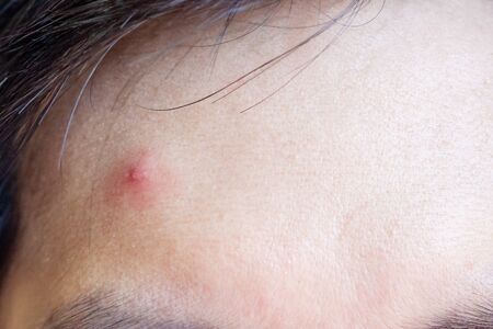 Cropped shot view of redness acne on Asian woman forehead. Conceptual of beauty and skin problems.