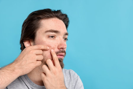Young man with acne problem on light blue background, space for text