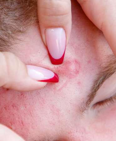 Man treats facial blemish with acne patch, promoting skincare, self-care, and healthy hygiene habits.