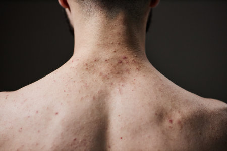 Back view of young adult man showing acne and skin blemishes on neck and upper back