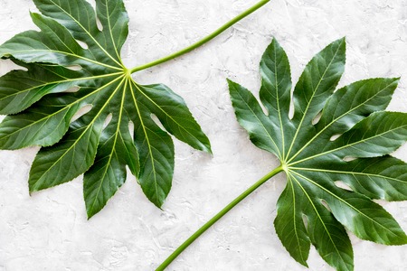 Green leaf pattern on linen texture background. Flat lay, top view.