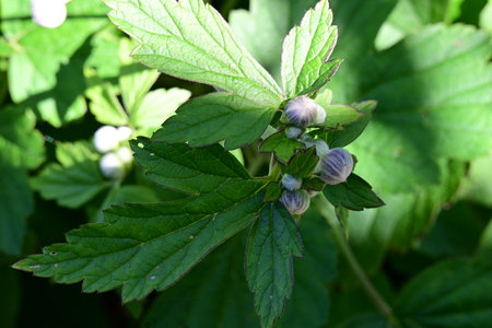 A leafy green plant with a cluster of black berries on it. The berries are small and clustered together, giving the plant a dense and lush appearance. Concept of abundance and growth