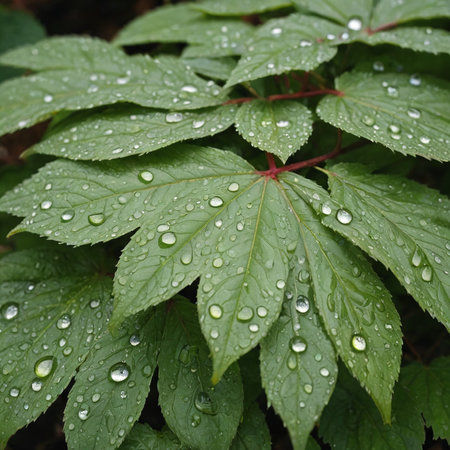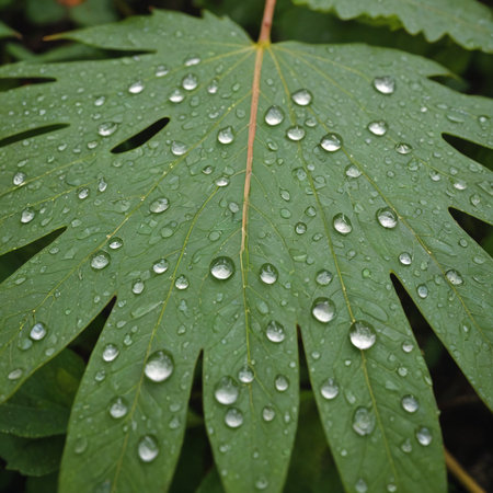 Water droplets rest on broad green leaves, creating a refreshing look in a natural setting after a recent rain shower.