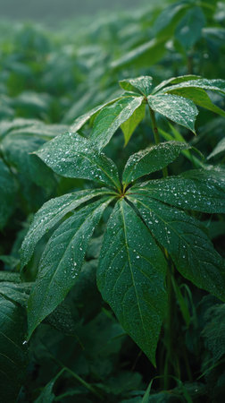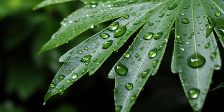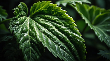 This image captures a close-up view of vibrant green leaves adorned with water droplets, showing the intricacies of their texture and the fresh, invigorating essence of nature in a visually appealing manner.