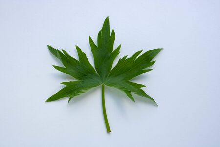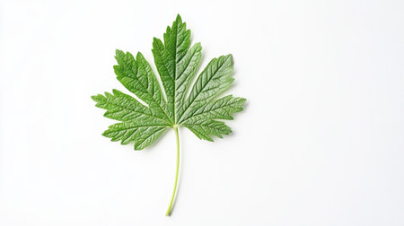 A single bright green leaf isolated on a pure white background, showcasing its vibrant texture and detail