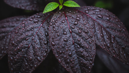 A detailed close-up view of a dark, richly colored purple or burgundy plant leaf. The leaf surface is adorned with numerous tiny, glistening water droplets, likely from rain or morning dew, which beautifully highlight its textured veins and intricate structure. A small, brighter green leaf or shoot peeks out from the top, providing a subtle yet striking color contrast. The background is softly blurred, expertly drawing focus to the intricate details and vibrant wetness of the main leaf. This botanical scene evokes feelings of freshness, vitality, and the natural beauty found in a garden or forest environment.