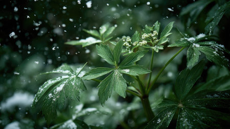 First snow falling gently on Bitter leaf, a few snowflakes drifting slowly and settling on the leaves; fresh air.
