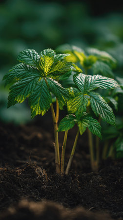 American ginseng with small fresh leaves, growing upright in fertile soil, sunlight filtering gently, realistic textures, vibrant green tones, natural photography style, wide balanced composition