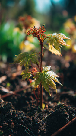 Red maple with small fresh leaves, growing upright in fertile soil, sunlight filtering gently, realistic textures, vibrant green tones, natural photography style, wide balanced composition