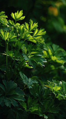 A wide shot of Lovage swaying gently in the wind, realistic photography style, bright and vivid colors, natural lighting.