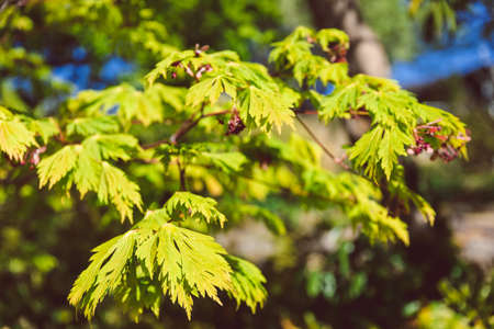 close-up of japanese maple plant outdoor in sunny backyard shot at shallow depth of field