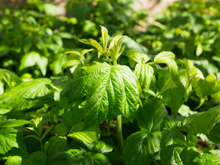 Raspberry leaves close-up. Shallow depth of field.