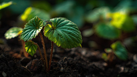 Begonia with small fresh leaves, growing upright in fertile soil, sunlight filtering gently, realistic textures, vibrant green tones, natural photography style, wide balanced composition for timelapse video.