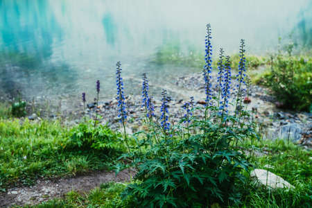 Many amazing blue flowers of larkspur grows on shore of mountain lake with clear azure water. Scenic nature background with beautiful larkspur flowers closeup on lake with turquoise smooth water.
