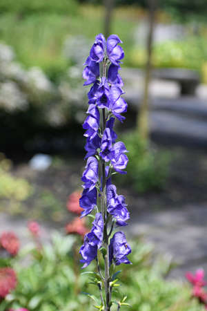 Monkshood, Aconitum napellus, blossom with purple blue flowers in garden, Netherlands
