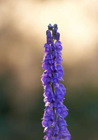 purple aconite inflorescence on blurred floral background