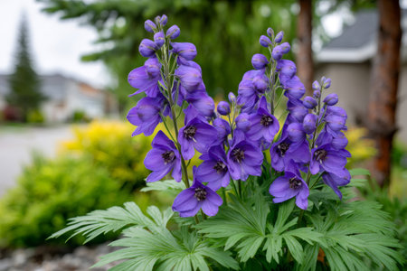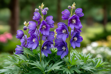 Delphinium blooming with many purple flowers and green leaves in a garden setting