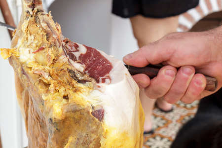 Serrano ham. Traditional Spanish ham, Slicing of dry-cured ham in Spain