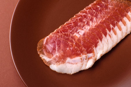 Meat, ham, jamon, or prosciutto sliced for breakfast bruschetta. Sliced ham, jamon, or prosciutto as a food background for your design
