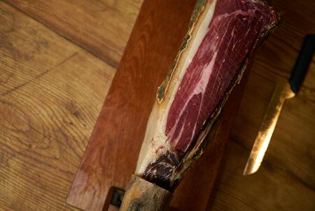 Dry-cured spanish ham Jamon. Close-up view.