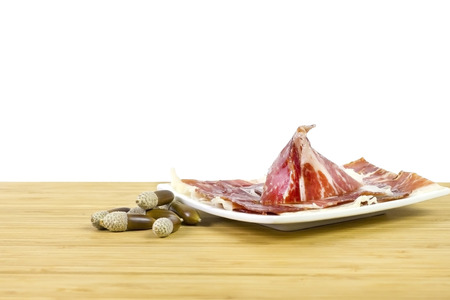 Iberian ham with acorns over a white background acorn Jamn