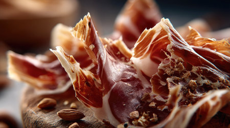This close-up image captures exquisite thin slices of gourmet ham on a rustic wooden board. Surrounded by almonds, it showcases culinary elegance and inviting textures.