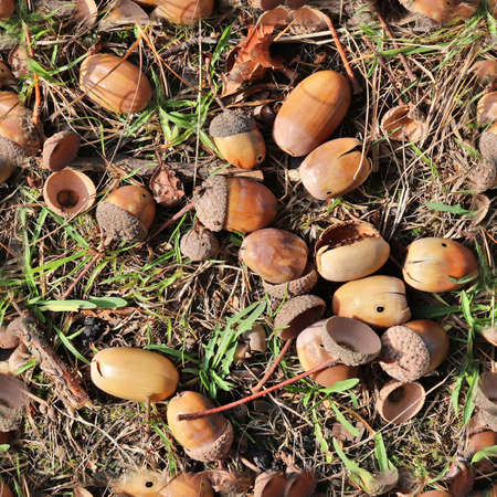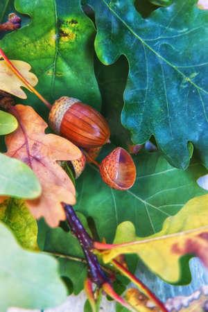 Autumn leaves and acorns on the ground. Autumn background.