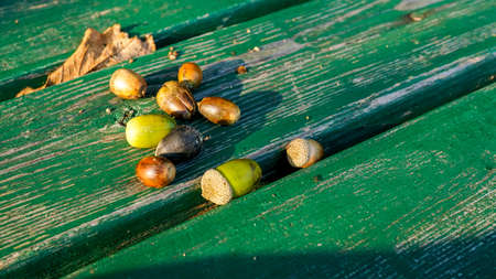 Acorns on a green bench in the forest.