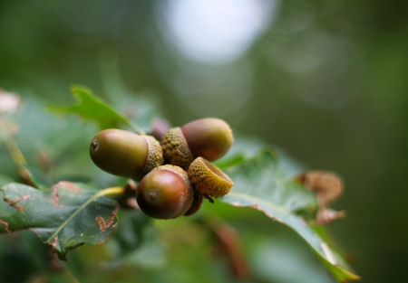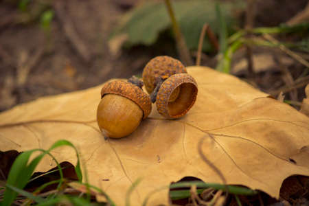 Acorns on autumn leaves, shallow depth of field, selective focus
