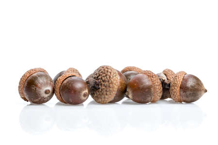 Ripe yellowed dry acorns collected in autumn, ripe oak seed, isolated on white background