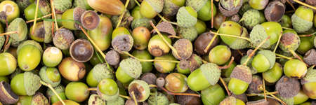 Green and brown acorns as background. Panorama top view