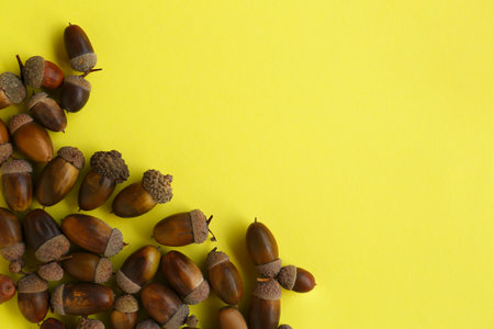 Many acorns on yellow background, top view. Space for text
