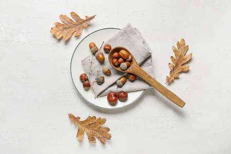 Autumn fruit of acorn on wooden retro table in white colours