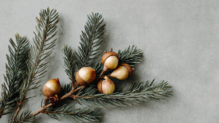 top shot of rape acorns arranged on gray textured paper, branch with leaf, horizontal template, space for text