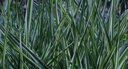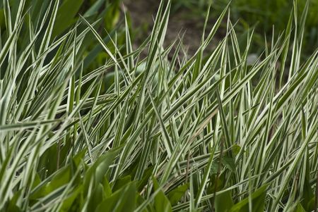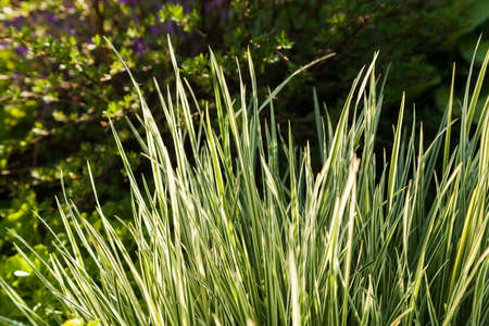 Decorative green and white striped grass. Arrhenatherum elatius bulbosum variegatum. Soft focus. Natural background.