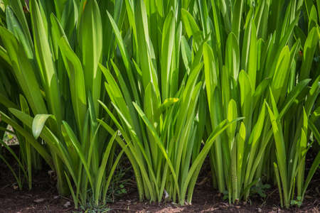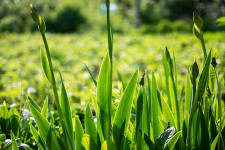 Flower Iris before blossom with green leaves texture background, plants in a garden