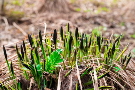 Marsh sedge growing on a hummock breaks through last year's dry leaves in spring close-up.